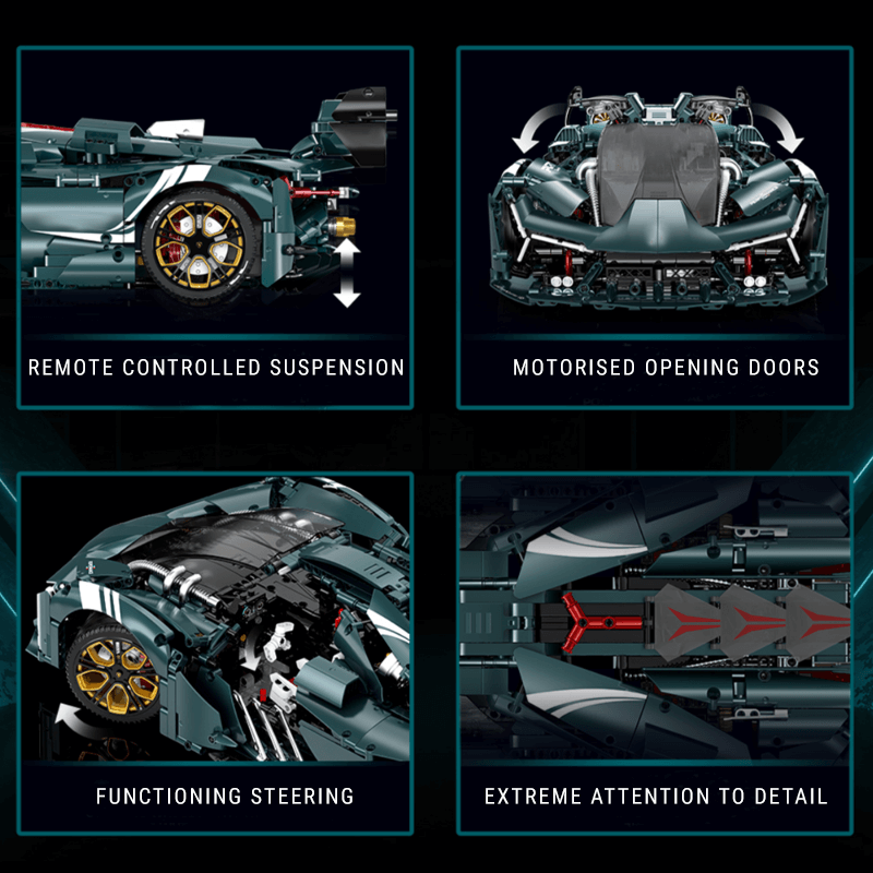 Dieses außergewöhnliche Modell im Maßstab 1:8 spiegelt mit über 3400 Teilen die charakteristischen Merkmale des Autos wider und bietet ein komplexes und fesselndes Bauerlebnis. Die galvanisierte Mattlackierung fängt seine Eleganz ein, während die maßgefertigten Räder und die komplexen Details des Modells, wie der detailreiche Motorraum mit beweglichen Kolben und aktiven aerodynamischen Elementen, die beispiellose Leistung des Autos würdigen.